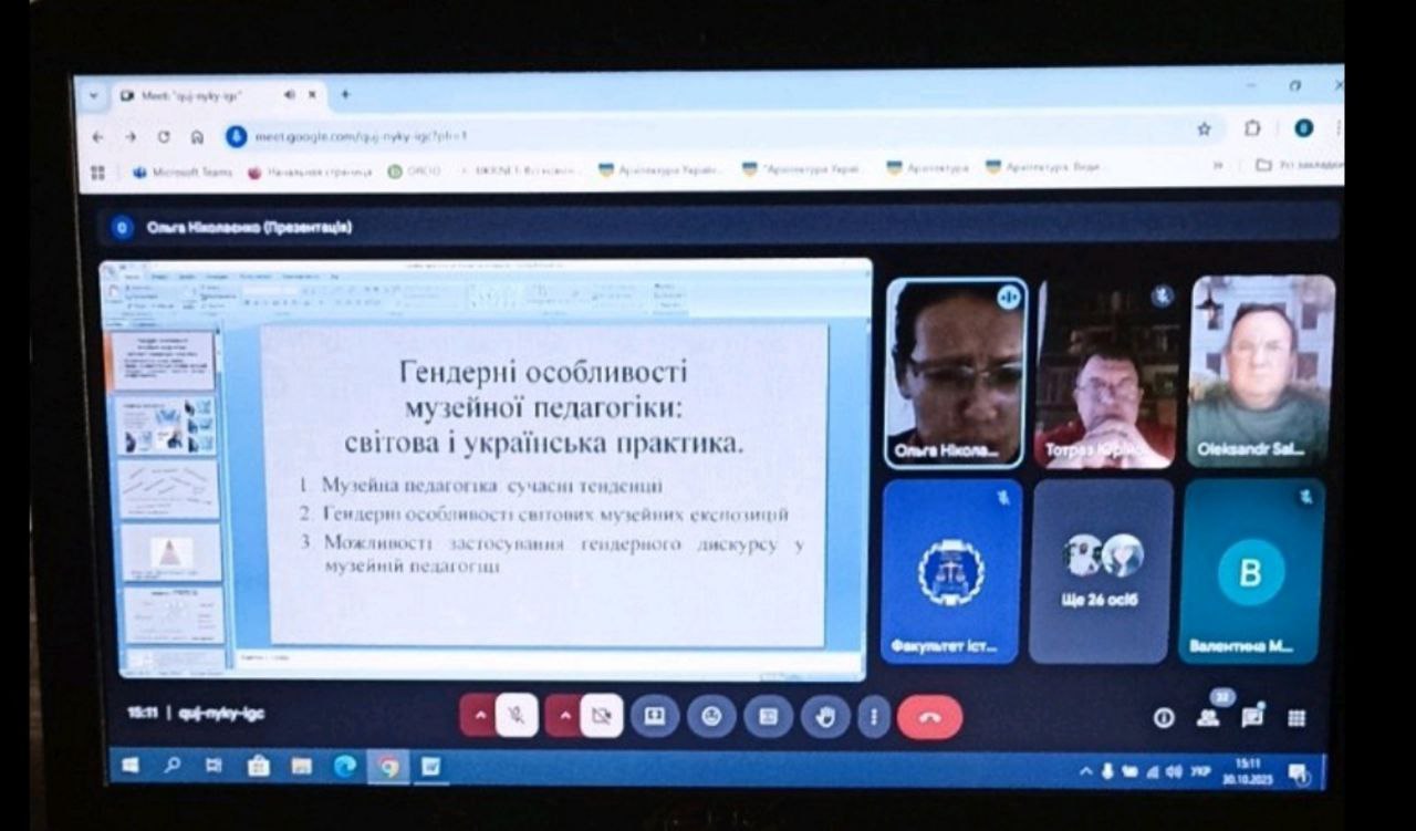 30 жовтня 2025 року члени кафедри історії і культури України та спеціальних історичних дисциплін факультету гуманітарної освіти і соціальних технологій Університету Григорія Сковороди в Переяславі Валентина Молоткіна, Людмила Хмельницька, Тетяна Логвинюк, Наталія Новородовська та Олексій Остапчук – взяли участь у методичному вебінарі «Гендерні особливості музейної педагогіки: світова і українська практика», що проходив в онлайн-форматі.